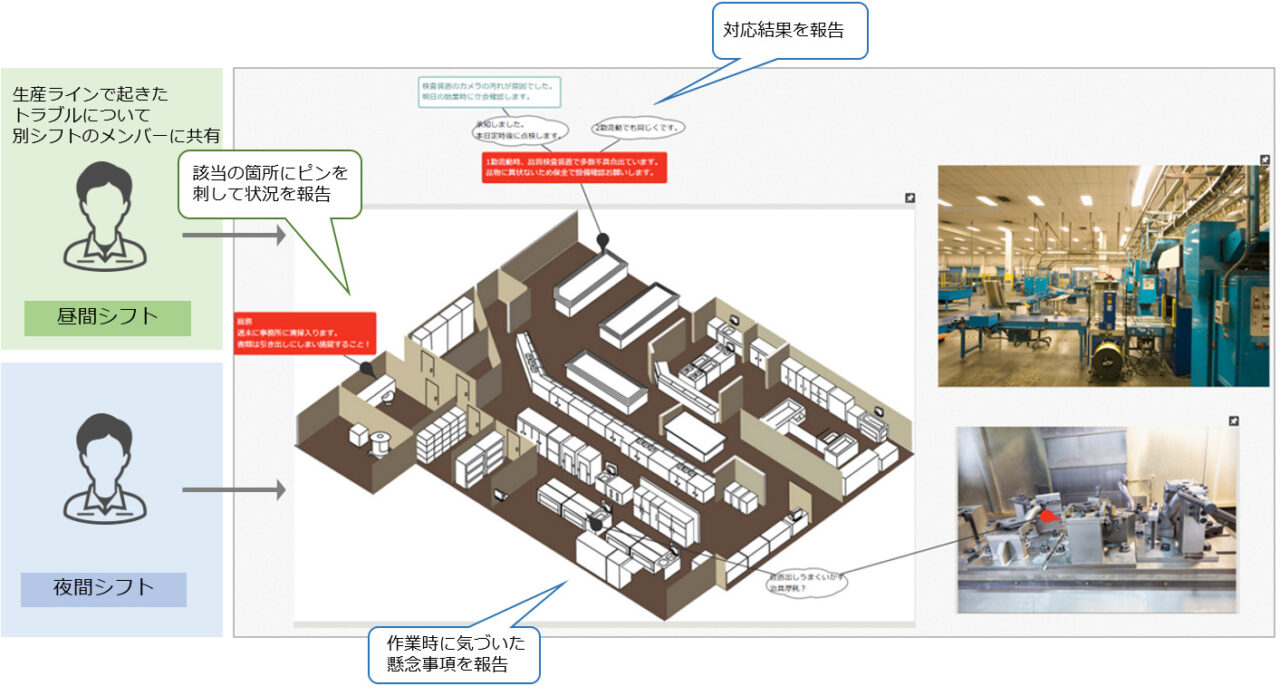 - 工場図面を貼りつけ、ピンを立ててコメントすることで、生産ラインのどこでどのようなトラブルが起きているのか、シフト間での正確な情報引継ぎが可能